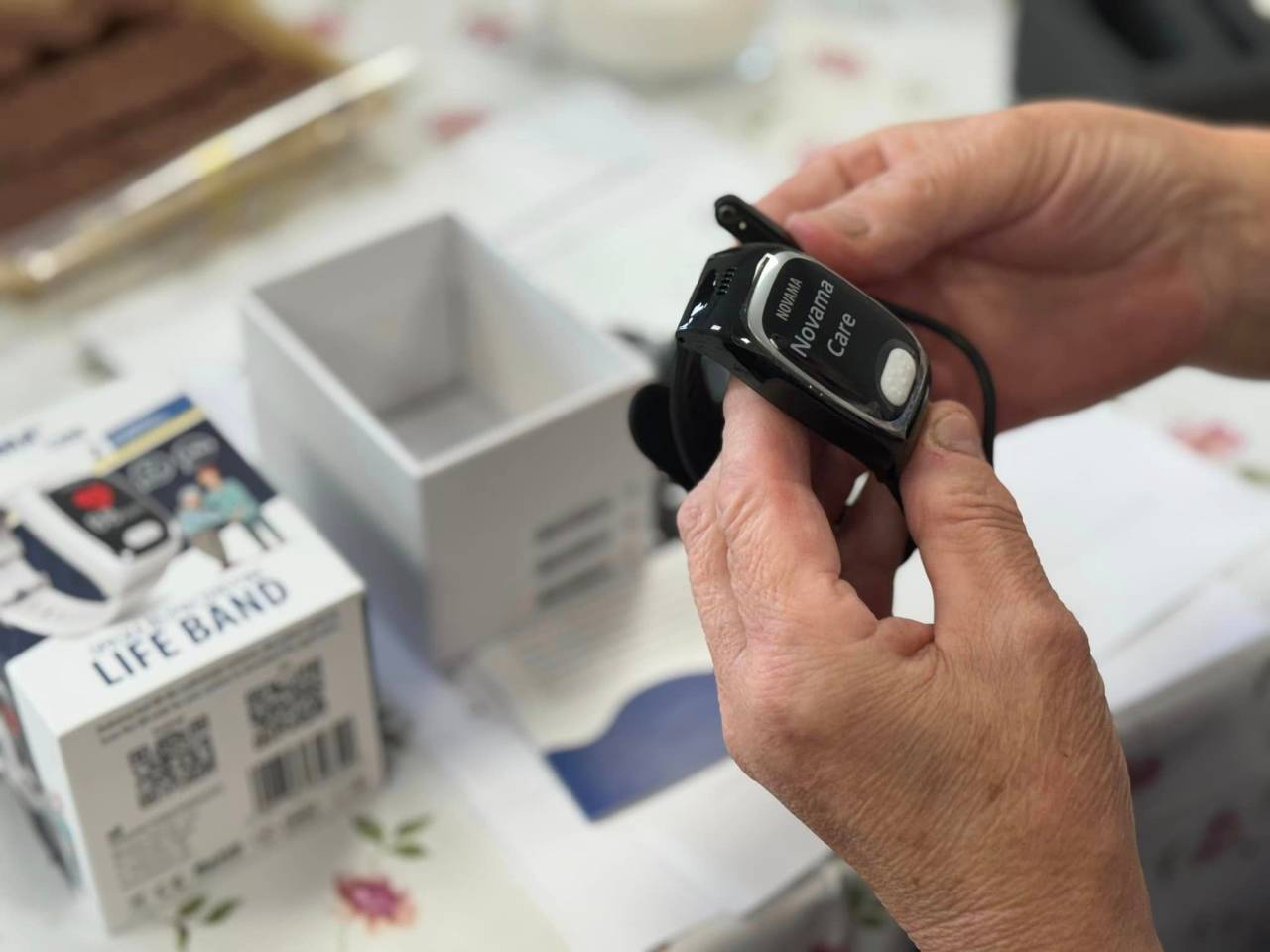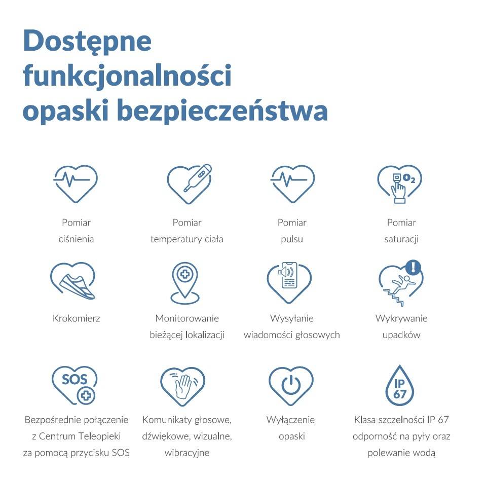 Sercem rozwiązania jest opaska bezpieczeństwa – niewielkie, wygodne urządzenie wyposażone w przycisk SOS, pomiar zmiany pulsu, ciśnienia, temperatury i saturacji, detektor upadków oraz funkcję rozmów głosowych. Dzięki temu senior może w każdej chwili wezwać pomoc, a rodzina zyskuje pewność, że bliska osoba jest pod stałą ochroną.
