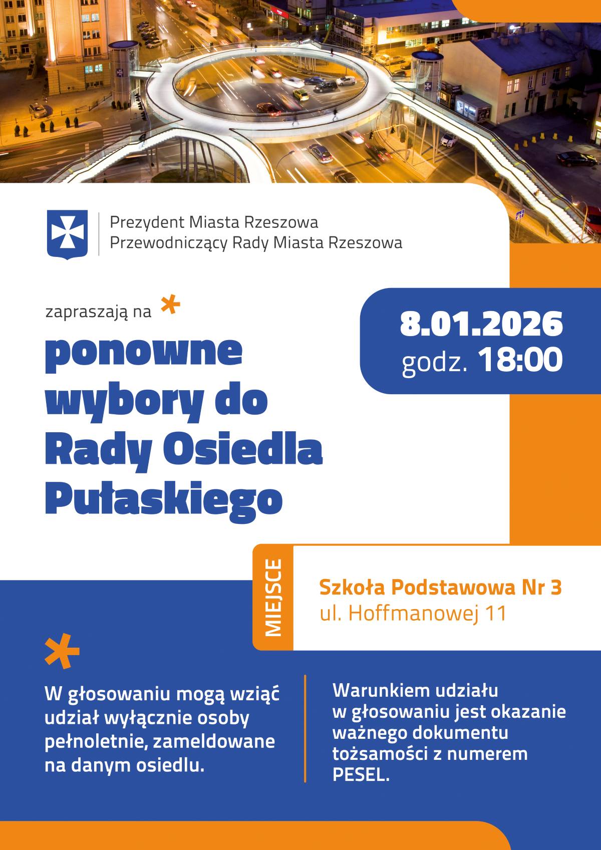 Zapraszamy mieszkańców Osiedla Pułaskiego na spotkanie wyborcze do Rady Osiedla Pułaskiego, które odbędzie się w dniu 8 stycznia 2026 r. o godz. 18:00 w Szkole Podstawowej Nr 3, ul. Hoffmanowej 11.