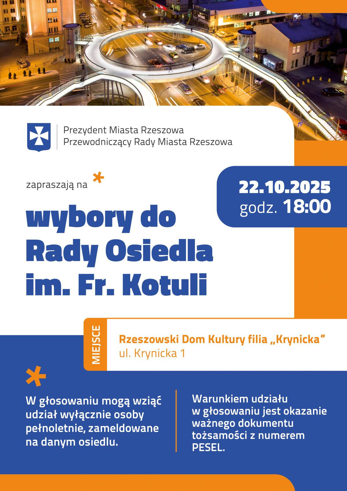 Zapraszamy mieszkańców Osiedla im. Fr. Kotuli na spotkanie wyborcze do Rady Osiedla im. Fr. Kotuli, które odbędzie się w dniu 22 października 2025 r. o godz. 18:00 w Rzeszowskim Domu Kultury filia „Krynicka”, ul. Krynicka 1.