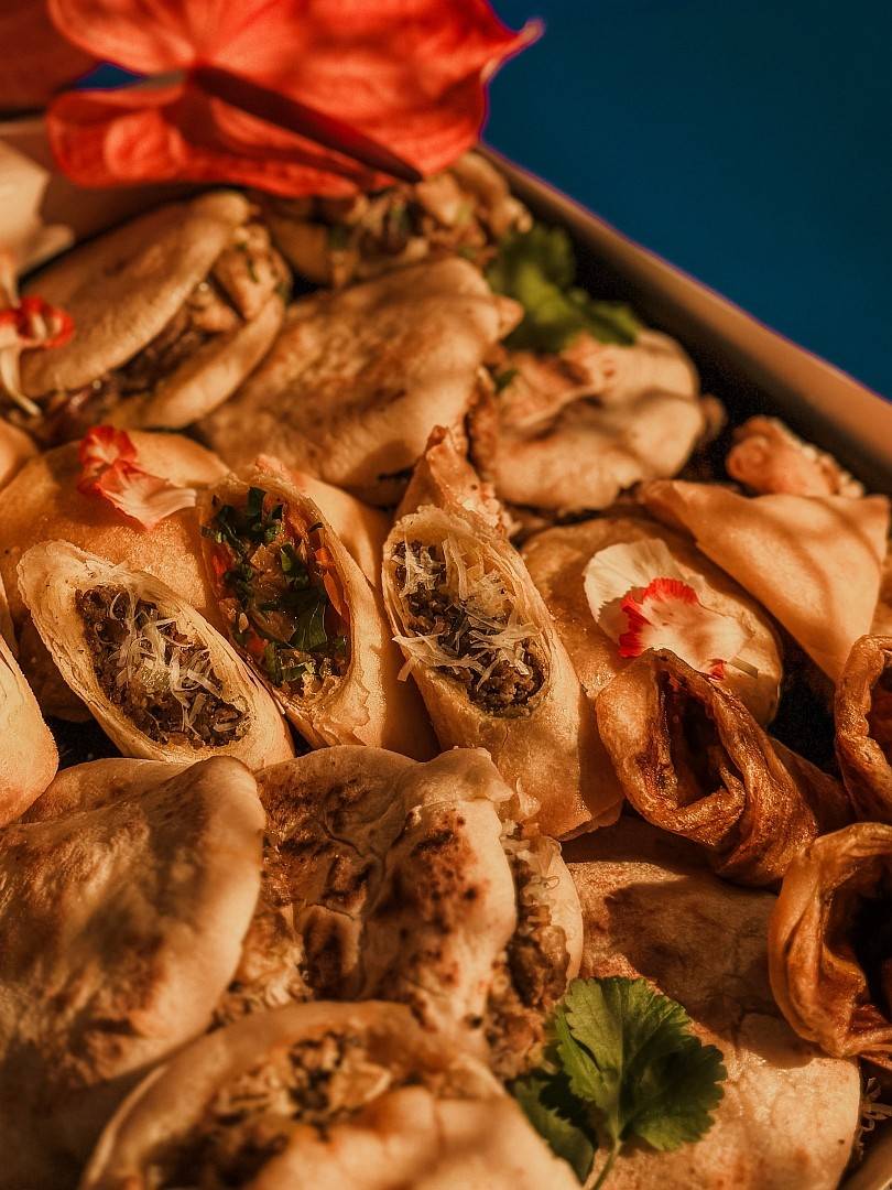 Zestaw mezze - Batbout Maamer z kurczakiem, Moroccan Cigar z wołowiną, Msemen Maamer z wołowiną i cebulą, sos chermoula.