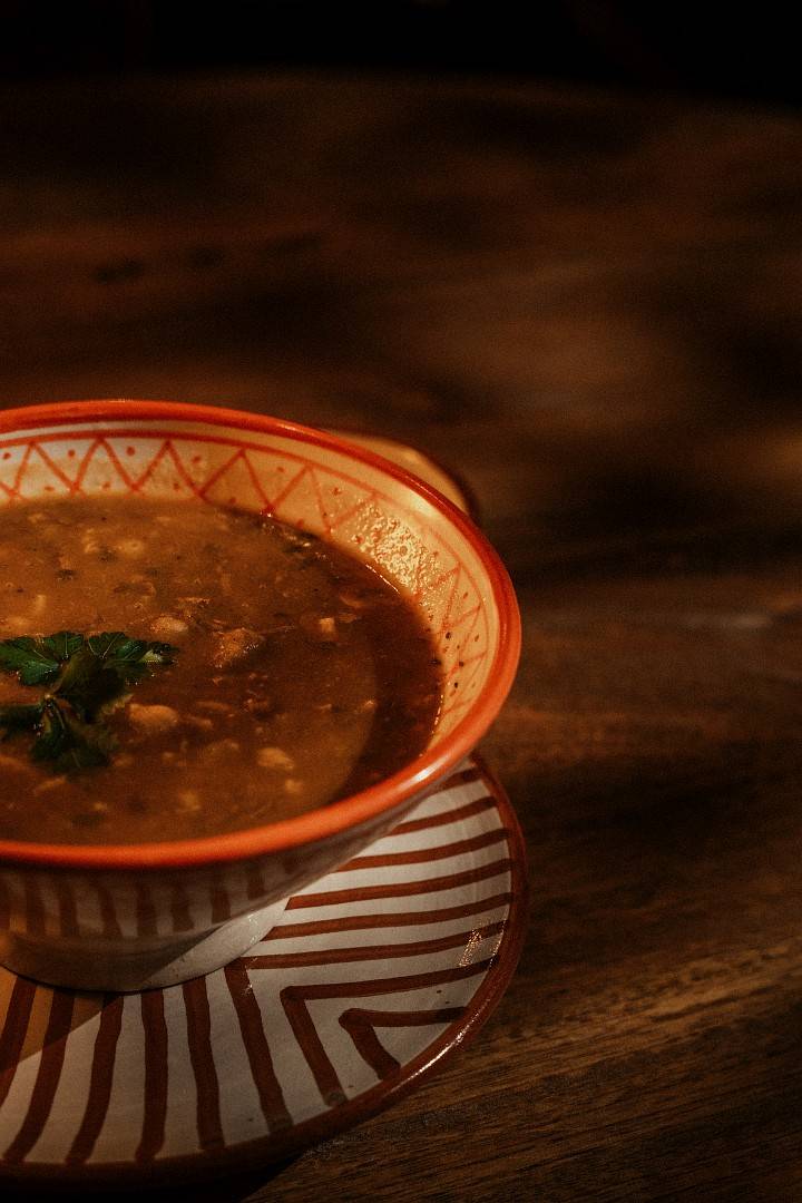 Harira wegetariańska - tradycyjna marokańska zupa z soczewicy, ciecierzycy i pomidorów, doprawiona aromatycznymi przyprawami, kolendrą i cytryną podana z daktylami.