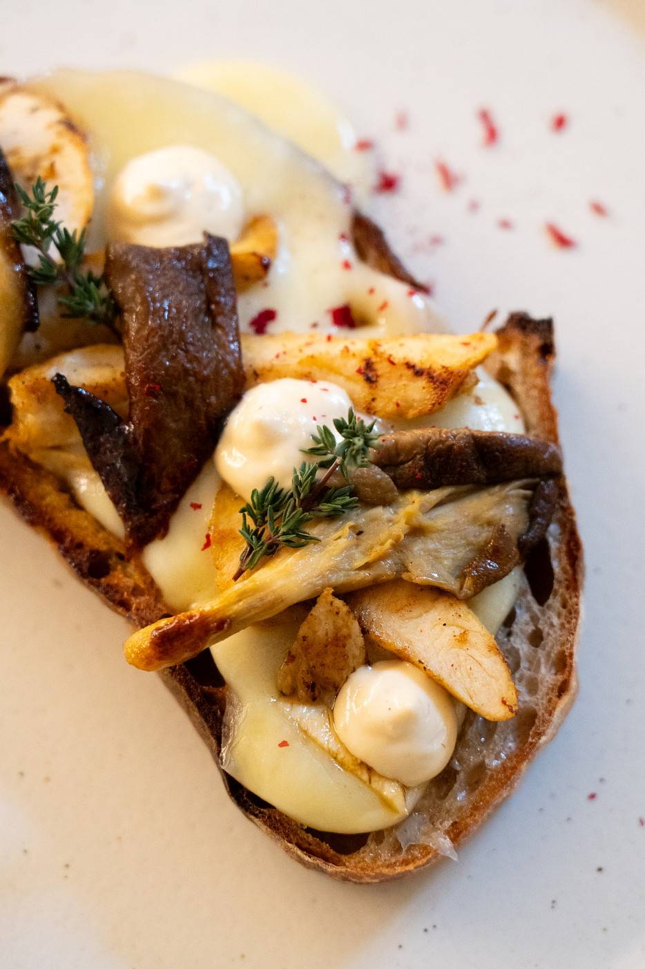 Pajda pszenno-żytnia, francuski ser raclette, soczysty kurczak z nutą cynamonu, boczniak w miodowo-musztardowej marynacie, majonez cebulowy.