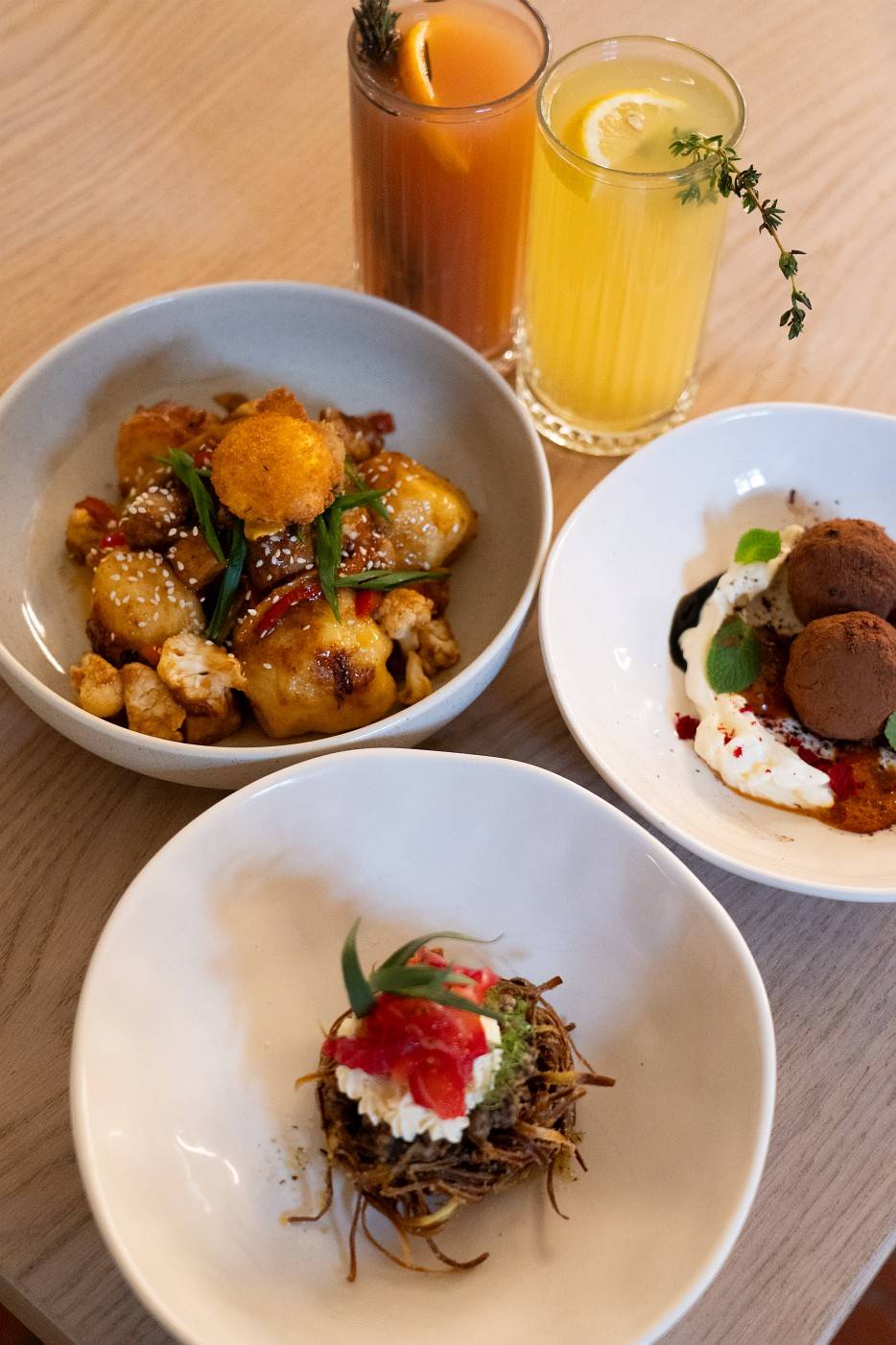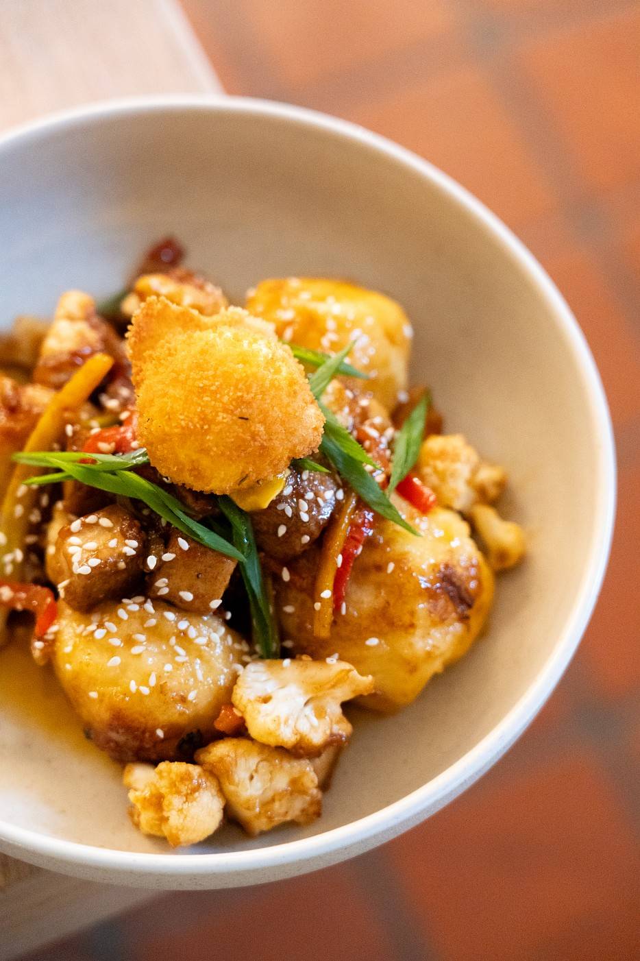 Kuleczki makaronowe nadziewane francuskim serem raclette, sos orzechowo-sojowy, wędzone tofu, papryka, żółta marchew, kalafior, szczypiorek, panierowane żółtko o chrupiącej strukturze.