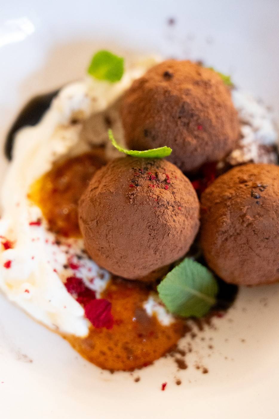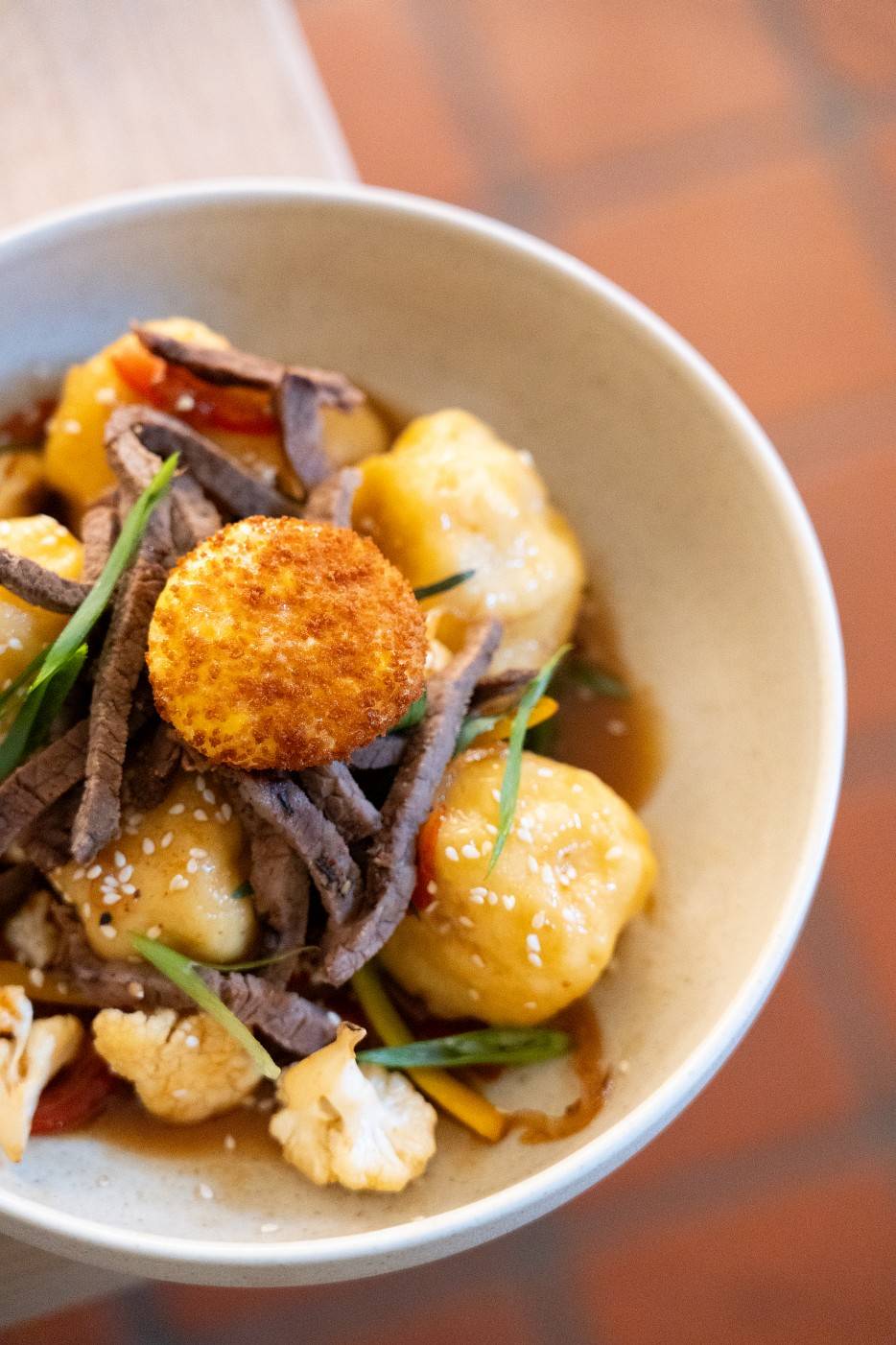 Kuleczki makaronowe nadziewane francuskim serem raclette, sos orzechowo-sojowy, pieczony rostbef, papryka, żółta marchew, kalafior, szczypiorek, panierowane żółtko o chrupiącej strukturze.
