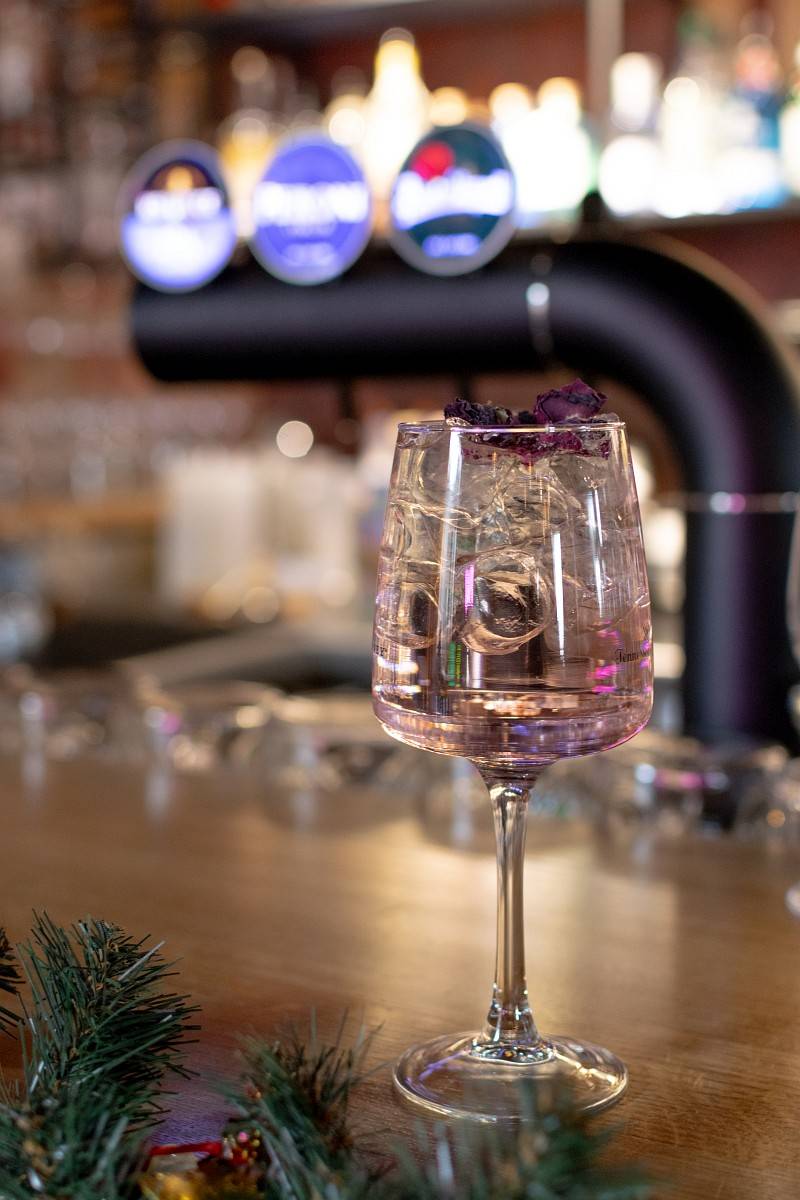 Koktajl bezalkoholowy - Spritz Różany: Tonik / syrop różany / limonka / jadalne płatki róży.