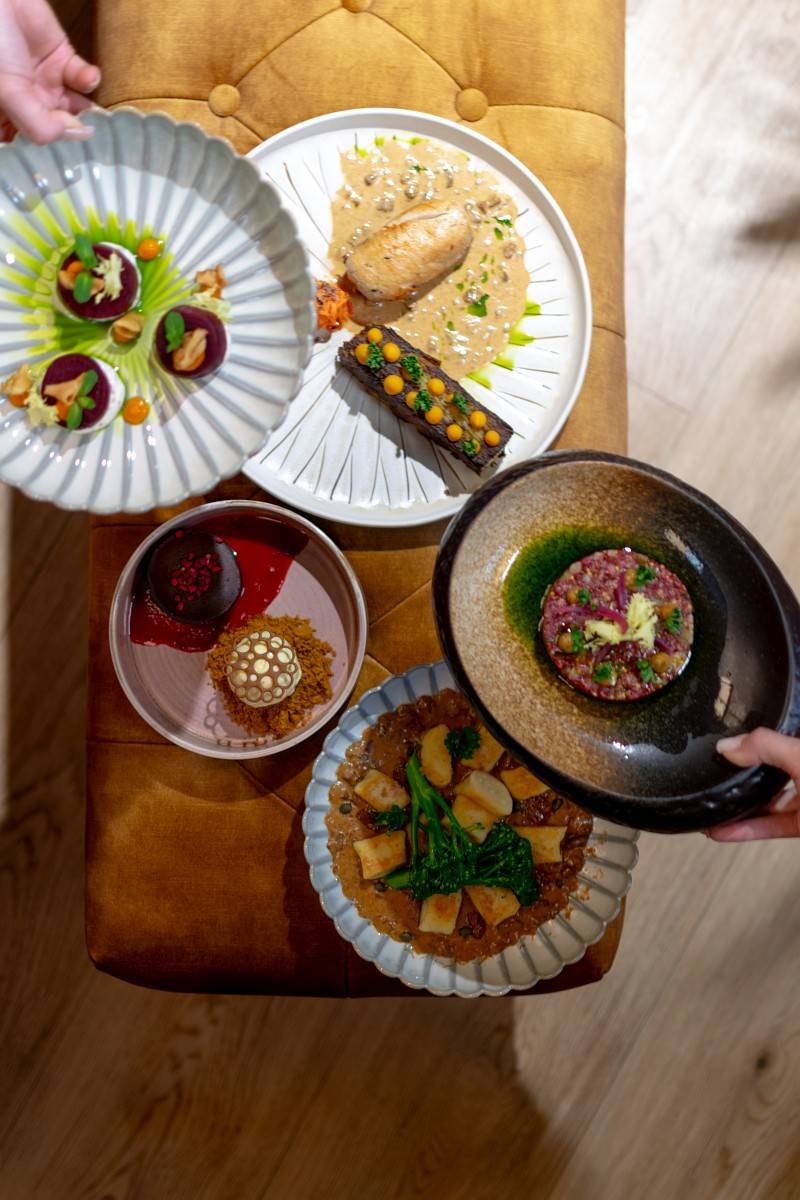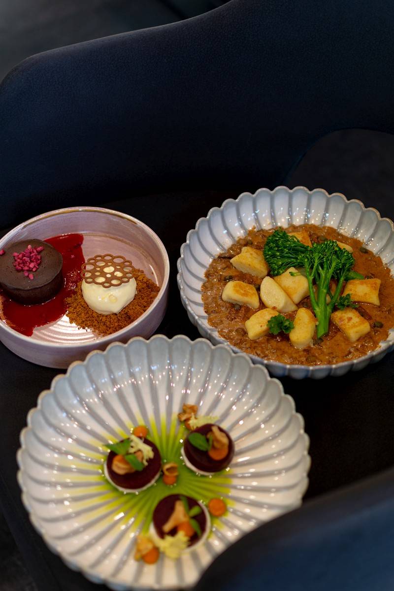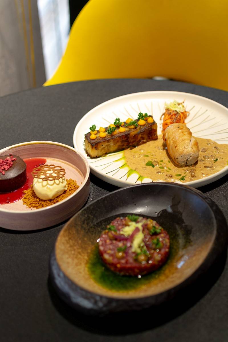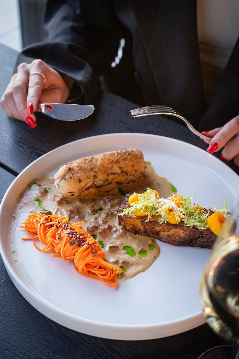 Filet z kurczaka sous-vide / gratin ziemniaczany / piklowana marchew / siemię lniane / aromatyczny sos kurkowy / mus z pieczonej dyni