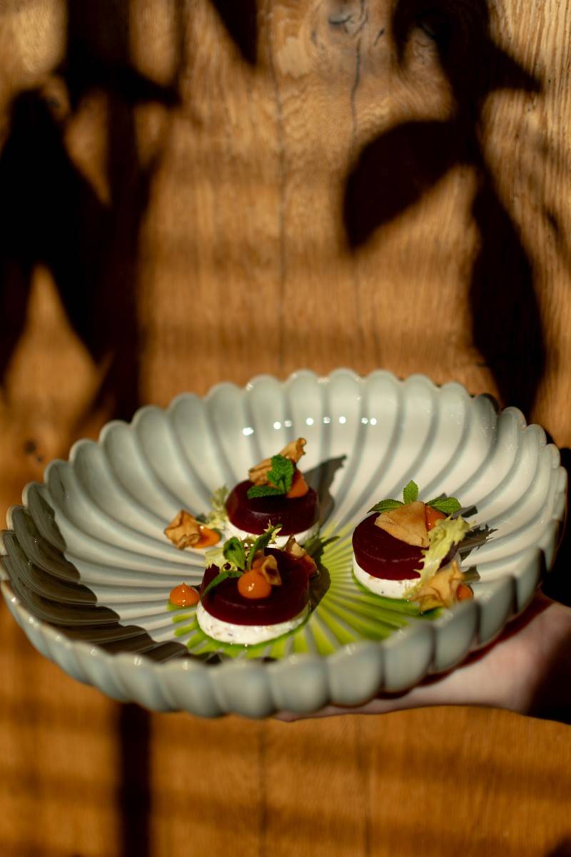 Wędzony burak / labneh sezamowy / rokitnik / świeża mięta / chips z topinamburu