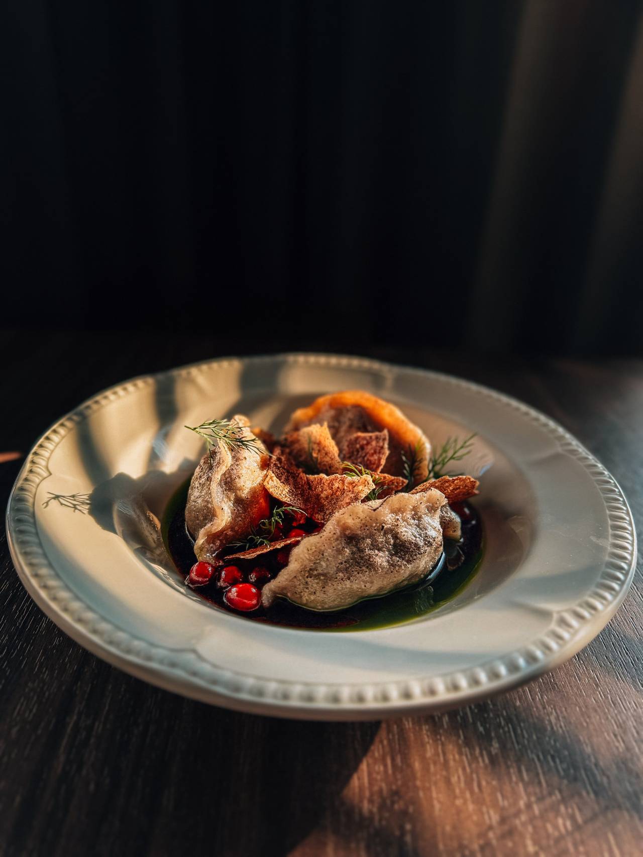 Pierogi z dzikiem - karkówka z dzika / grzyby / demi glace / żurawina.