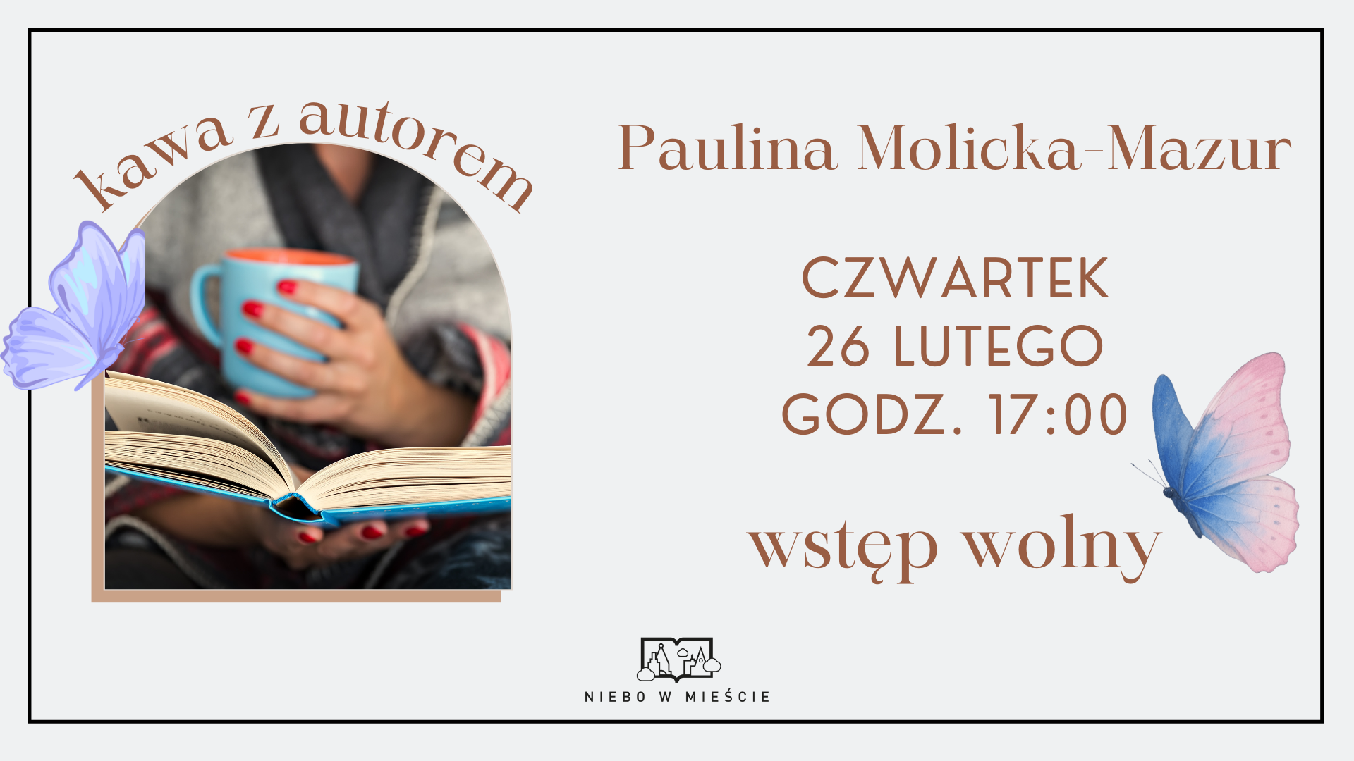 Przejdź do wydarzenia Kawa z autorem (luty) 26Lutego2026 Kawa z autorem (luty) Zapraszamy serdecznie na spotkanie z pokarpacką autorką książek Pauliną Molcką-Mazur, które odbędzie w naszej kawiarni w czwartek 26 lutego. 3 Maja 24, 35-030 Rzeszów, Poland Czytaj więcej