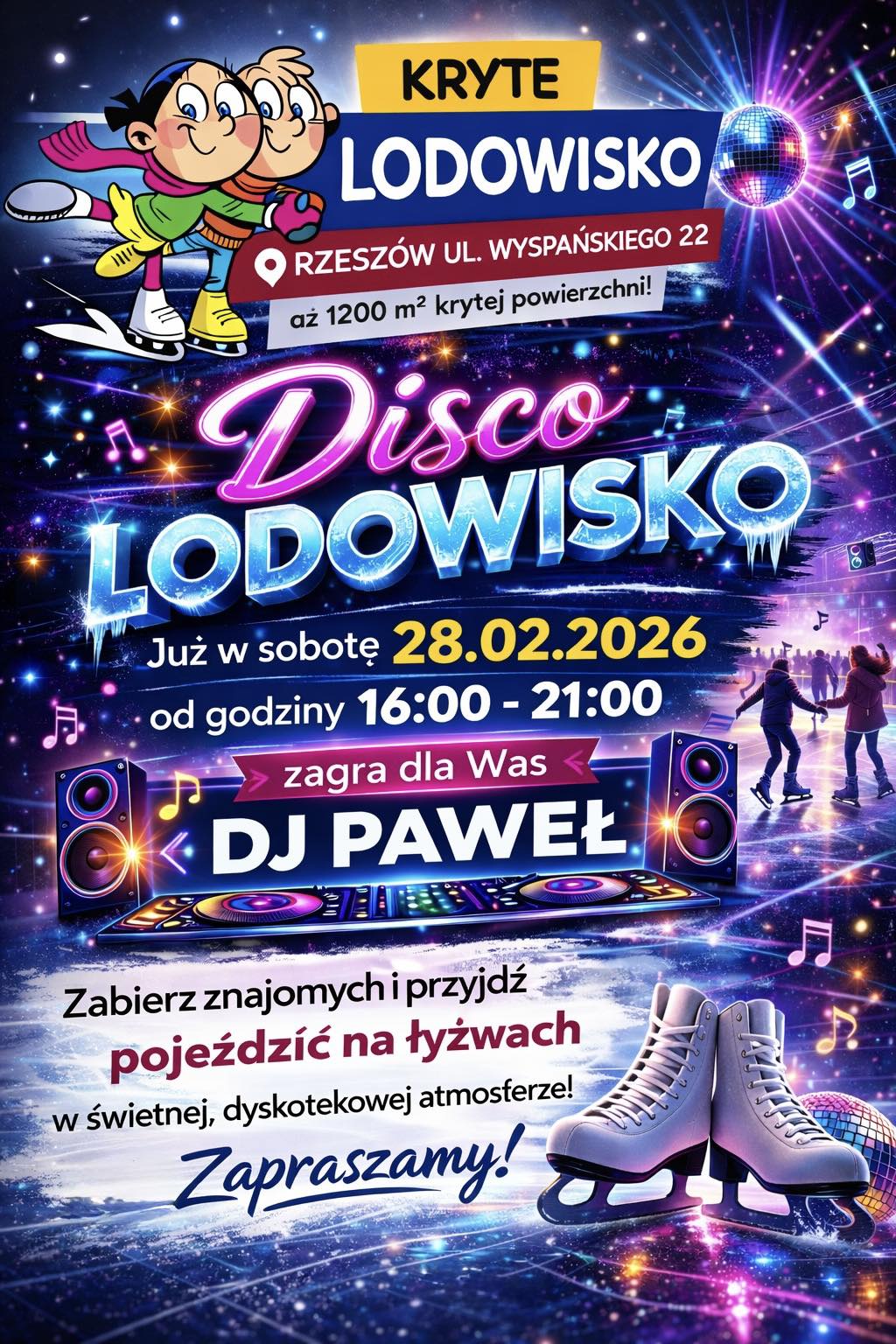 Przejdź do wydarzenia Disco Lodowisko 28Lutego2026 Disco Lodowisko Już w sobotę 28.02.2026 zapraszamy Was na wyjątkowe DISCO LODOWISKO! Wyspiańskiego 22 Rzeszów Czytaj więcej